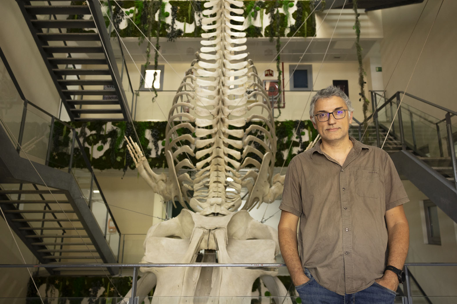 Un gran esqueleto de ballena de unos 6 metros de largo cuelga del techo del vestíbulo en la sede de la Estación Biológica de Doñana en Sevilla.